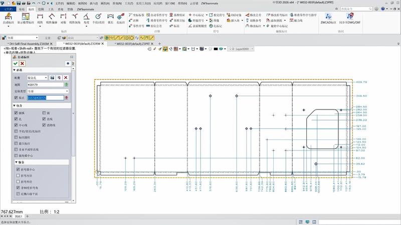 常规的产品零件结构都有一定的复杂度,需要多个不同的工艺尺寸,在不同方位进行多处标注,才能完整表达工艺要求,但过去需要工程师手动逐一标注,操作繁琐耗时长。 中望3D2026基于行业客户的反馈,增加对多种类型对象的自动标注,尤其对于钣金等规则,零件一次标好。