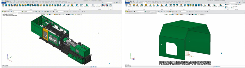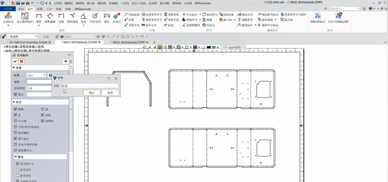 一、自动标注效率全方位提升 以对注塑机模型的钣金零件为例,中望3D2026工程图中可以设置多种类型对象的自动标注。常规标注对象如中心线、隐藏线。对于钣金对象,如折弯内径折弯角度等注释支持保存配置。
