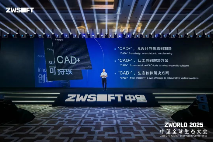 本次峰会主会场配备了中英多语言同声传译设备,确保了所有与会嘉宾在国际交流中全程无障碍、高效参与。同时,大会通过线上平台面向全球实时直播,吸引了超过十万名行业观众在线观看并参与互动,彰显了国产软件日益扩大的国际影响力与生态凝聚力。 二、前瞻视野:中望发布CAD+战略助力可持续创新 在大会主题演讲中,中望软件管理团队系统阐述了公司的技术战略布局与创新实践成果,彰显了公司在工业软件领域的前瞻部署与实施能力。 “持续创新不仅是企业的战略选择,更是驱动工业进化的核心动力。”杜玉林董事长在《CAD+,推动工业可持续创新》演讲中强调:“加速数字世界与物理世界的融合共生,赋能组织与个人的可持续创新,是中望与所有伙伴共赢发展的基石。我们以‘CAD+’为技术支点,携手生态伙伴构建深度适配行业场景的解决方案,持续为客户创造价值。”