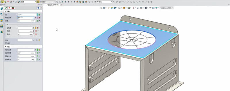 三、全新的参数化通风口功能 可快速多样化创建多组筋,且支持自动添加圆角和拔模。 ① 打开带有通风口形状草图的模型,点击通风口功能,再点击选中需要创建通风口特征的平面。