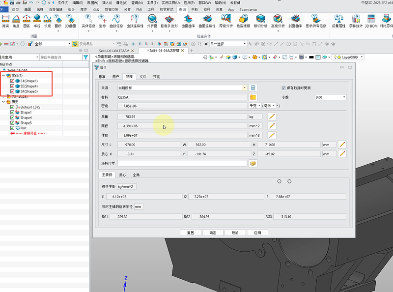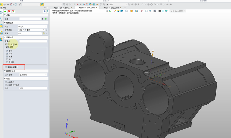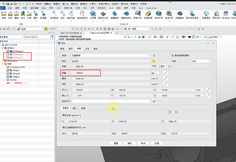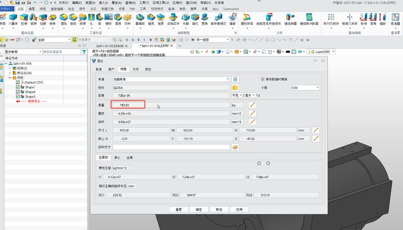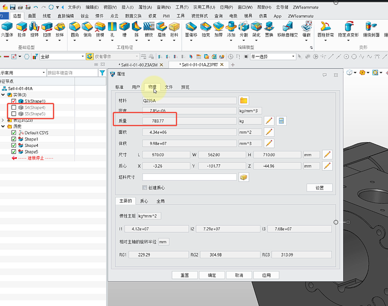 一、质量计算有误的原因分析 中望3D模型导致质量计算有误的原因总结了以下三个方面。 【原因1】 【质量属性】命令选项设置影响。以当前这个【质量】为【783.93】kg的零件为例:
