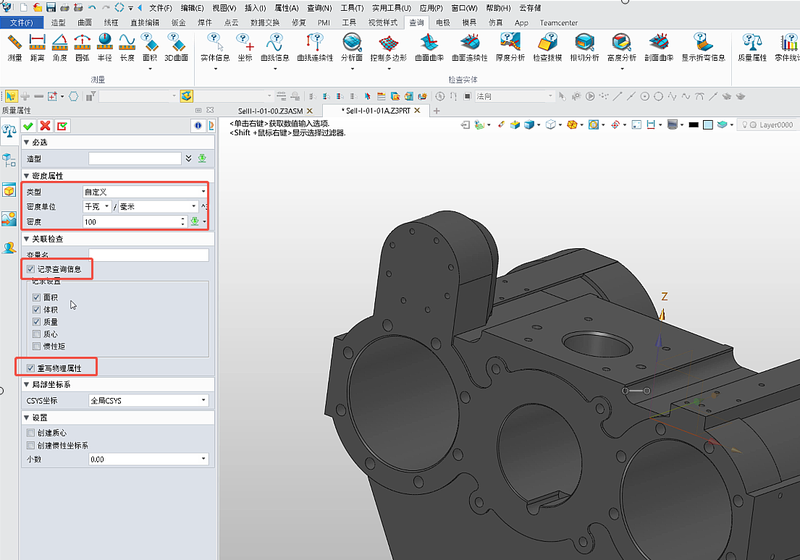 1. 使用【查询】模块中的【质量属性】且自定义密度查询质量时,同时勾选了【记录查询信息】和【重写物理属性】,记住点击【确定】后显示测量出的质量数值;