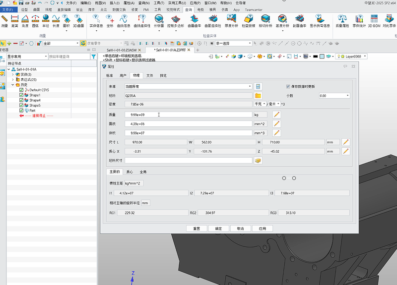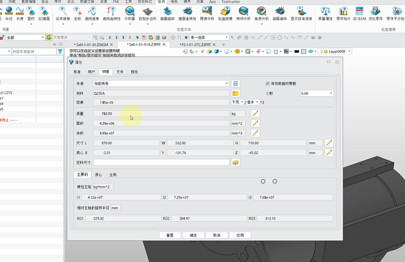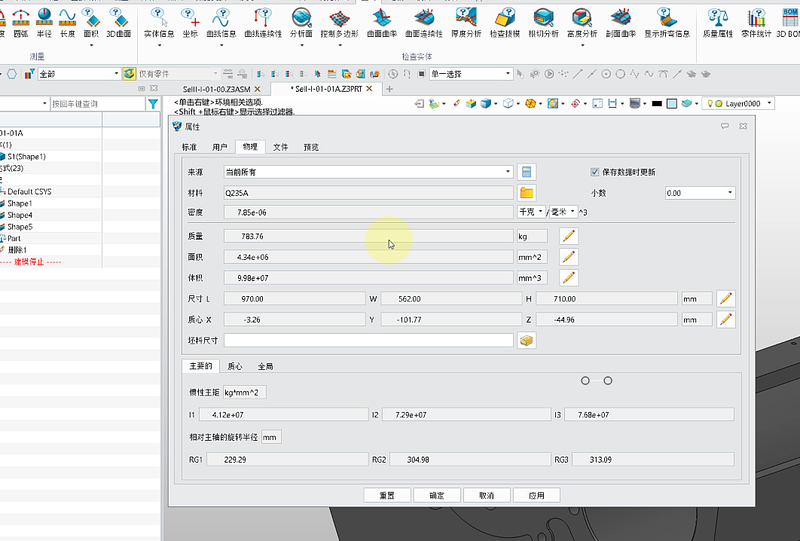 ② 重新回到物理属性页,这时【质量】为【783.77】kg,质量自动变成不计入隐藏实体的结果。 2. 装配环境中 ① 当前这个装配包含隐藏的实体造型和隐藏的零部件,【质量】为【1529.52】kg;