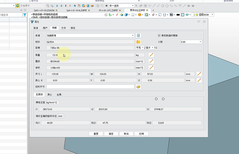 2. 通过点击【属性】菜单中【属性】命令的【物理】标签页重新回到物理属性页,此时原有正确的物理属性数据变成【用户自定义】类型的查询所得质量数值,显示的质量数值不是模型本身的质量。