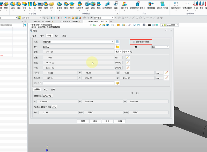 【原因3】 模型质量未进行自动、实时更新设置,模型修改后若未及时手动处理,质量数据将无法同步更新。 以另一个【质量】为【49.65】kg且物理属性页没有启用【保存数据时更新】功能的回转轴为例: