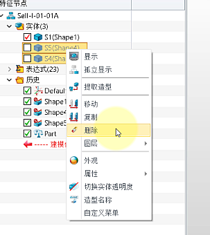 ④ 排查装配的【历史管理器】中是否也有多余的实体造型,同样选定后【右键】,选择【删除】。